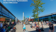 Hier haben wir für Sie einen Rundgang zusammengestellt: Sie können das angezeigte Bild vergrößern und sich mit gedrückter Maus oder dem Finger am Handy um 360 Grad im Bild drehen. Wenn Sie auf ein Plus-Zeichen klicken, erhalten Sie weitere Informationen, und wenn Sie auf einen Pfeil klicken, gelangen Sie zu einem anderen Bereich auf dem Schulgelände. So können Sie sich nach und nach ein Bild von unseren Räumlichkeiten machen – und viele Videos anschauen.